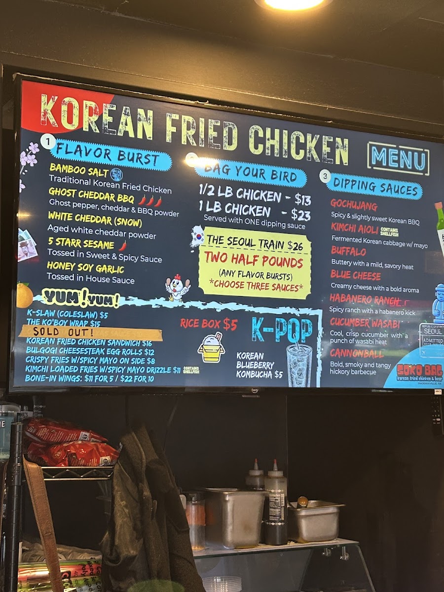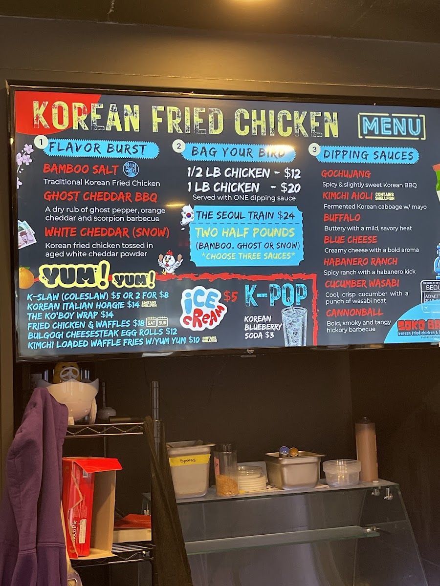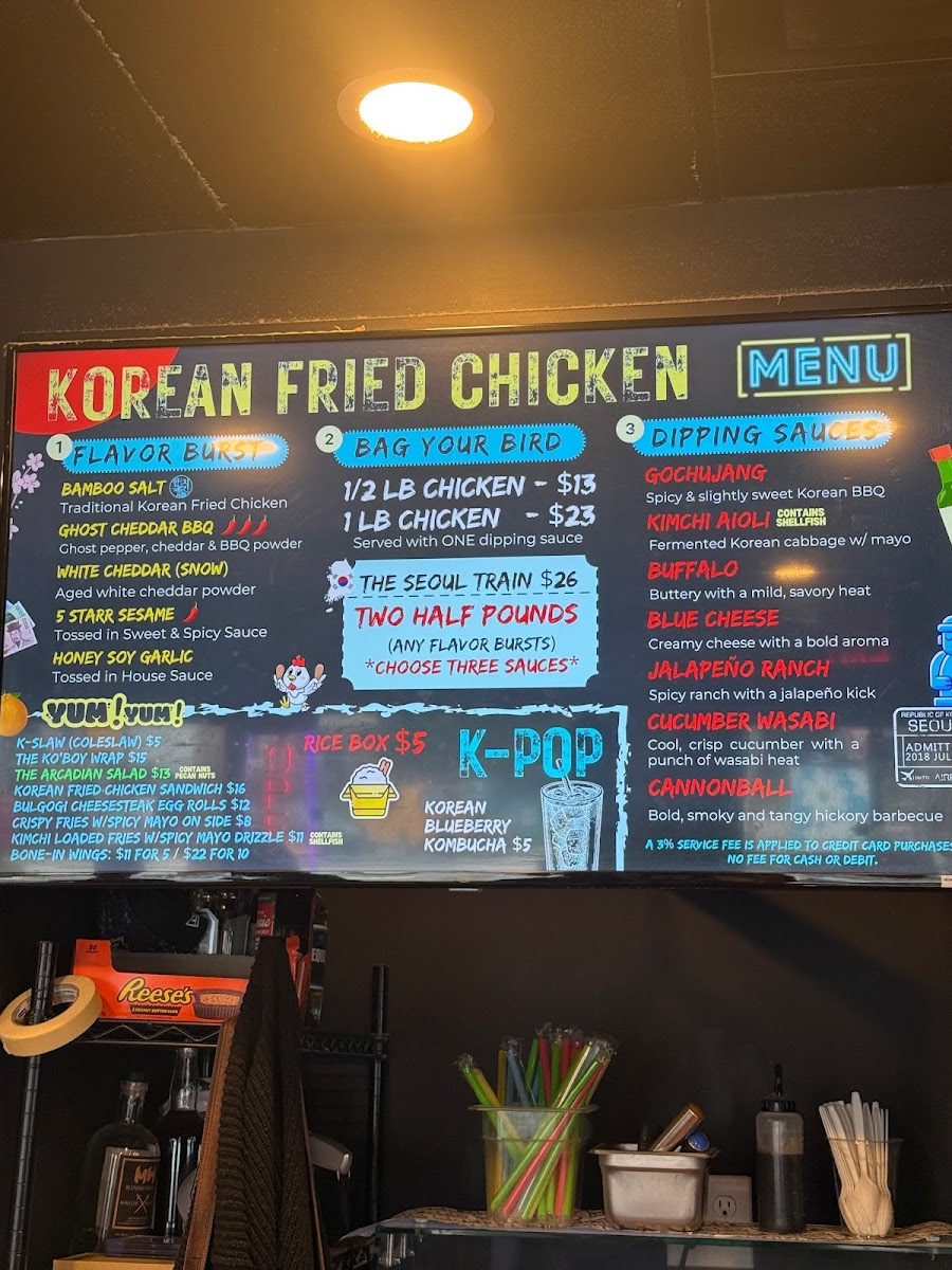 The best ticket to Korea! Your choice of two: Bamboo Salt, Ghost Cheddar BBQ or Snow Chicken (tossed in aged white cheddar powder) and three sauces on the side.