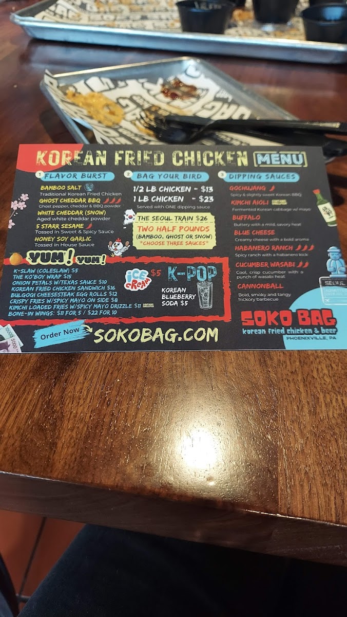 5 jumbo wings and your choice between our three flavors: Bamboo Salt, Ghost Cheddar BBQ or White Cheddar (Snow). You then get your choice of one of our sauces: Gochujang, Kimchi Aioli, Buffalo, Blue Cheese or Jalapeño Ranch.